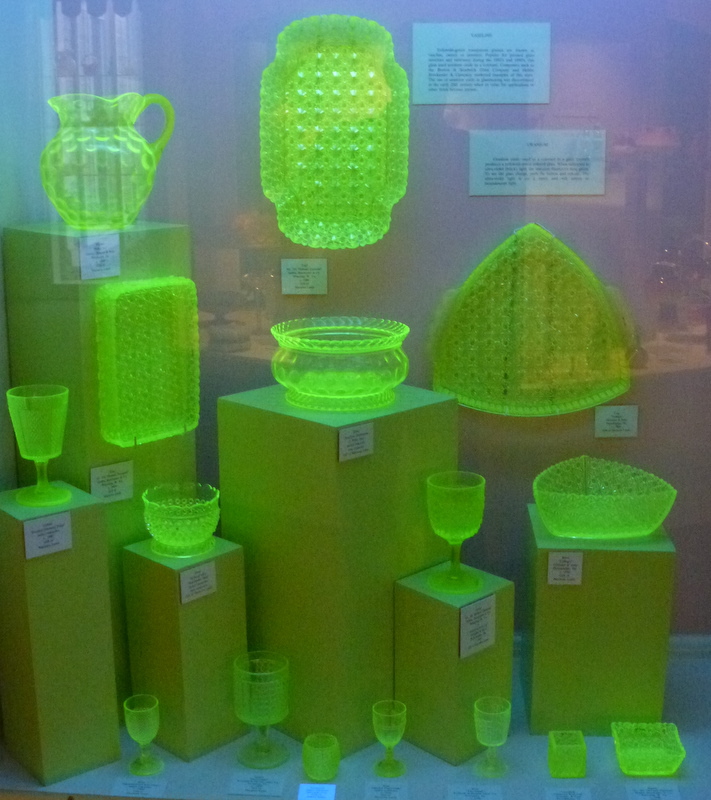 I first came across uranium-infused glass in the Millville Art Museum in New Jersey. They have a fine collection of tableware made with uranium-infused pressed glass. As a side note, Millville was the hub for pressed glass in the 1880s. When it was discovered that uranium could be used to create nuclear bombs, all uranium was diverted from ornate glassware to bomb making. For example, it was used in the construction of Little Boy, the first nuclear weapon used in war. Since then, uranium has rarely been used for any other purpose. A uranium atom has 92 protons and 92 electrons, of which 6 are valence electrons.