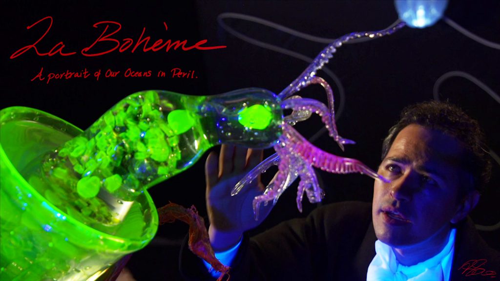 I traveled the globe collecting microscopic plankton and even in the most remote place found micro-degraded plastic in all of my  samples,which was only the pollution she could visible through the microscope. “La Bohème: Portrait of Our Oceans in Peril” is a series of luminescent glass sculptures and operatic performances which are an homage to impending peril of microscopic plankton which play a crucial role in regulating our planet’s atmosphere by producing half of the world’s oxygen, sequestering CO2 and composing the foundation of the ocean’s food chain.
