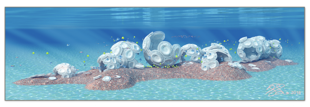 The Rococo Cocco Reef is multi-dimensional, a living art work, educational tool, eco touristic dive site, The Rococo Cocco Reef habitat for fish and coral to thrive, and a reef brake that attenuates waves protecting shorelines endangered by rising sea levels due to climate change. will be created a utilizing substrate composed of minerals found in coral reefs that coral larvae are naturally attracted to using primarily different forms of calcium carbonate, therefore making it the perfect marriage between design and function. Coccolith discs are composed of calcium carbonate like the material that The Rococo Cocco Reef will be made of, this sculpture will itself become a carbon sink, mimicking the microscopic structures it portrays.