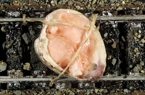 Cherrystone in Distress; miniature railroad tracks, rocks, shell, twine, 1993.