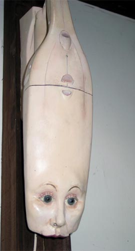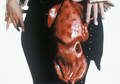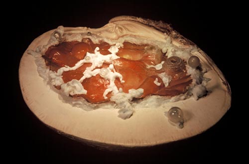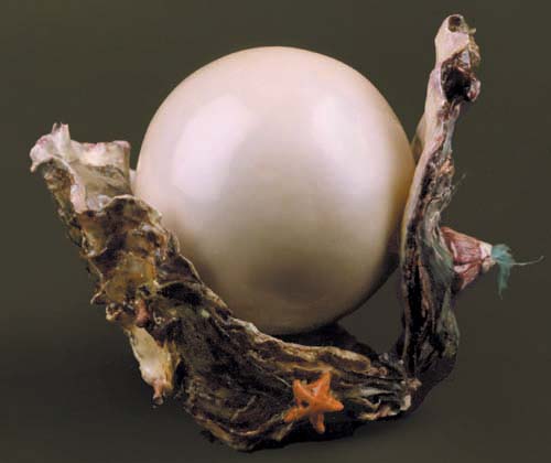 World’s Largest Pearl; oyster shell, resin, paint, feathers, wax, 1999.