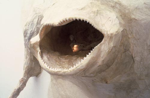 Self Portrait With Shark; shark jaw, rice paper, egg whites, lights, horseshoe crab, 1992.
