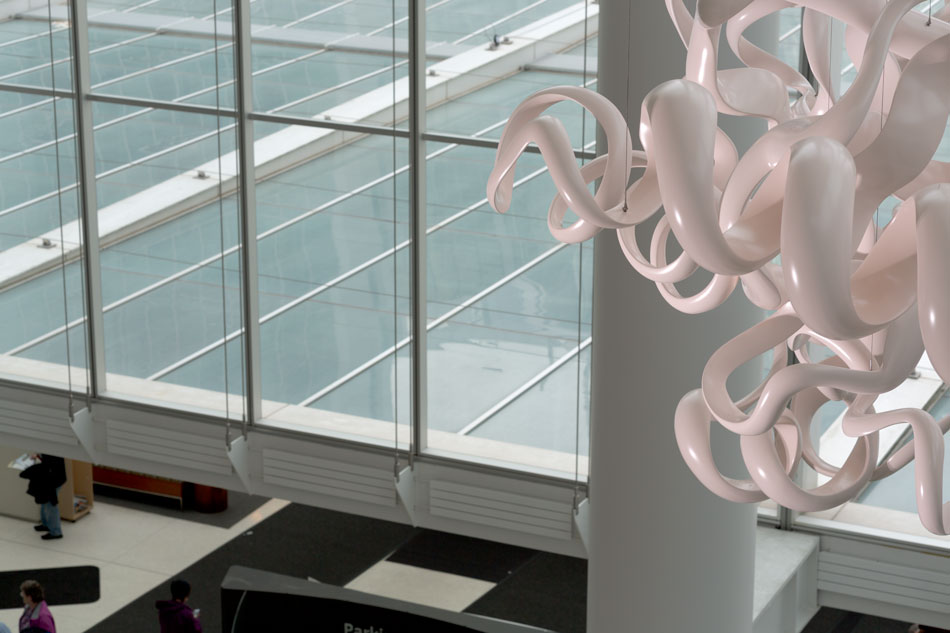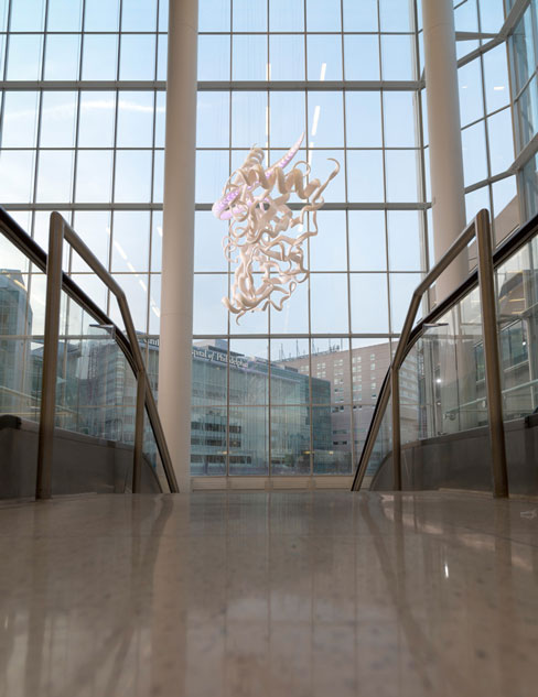 Homologous Hope is a delicate work of art that floats like a cloud above the atrium. Patients and their families entering the building look up and see hope on the horizon, hope inspired by the generosity of the Grays, by the creative environment of University, and by the efforts of the dedicated doctors and scientists working in the Center to prevent and cure BRAC related cancers.