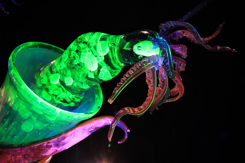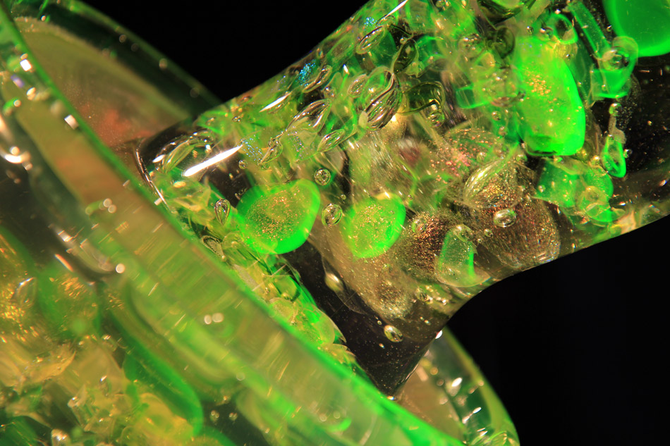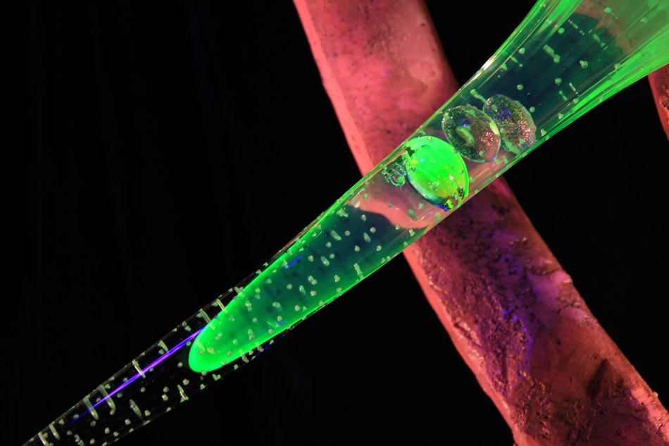 This series of sculptures is a follow-up to La Bohème, Series I. During her time on the research vessel Tara Oceans, Haseltine collected water samples from oceans all over the world. To her dismay, all of the samples contained bits of sunlight-degraded plastic which were covered in plankton. The sculptures in La Bohème, Series II are based on the images she saw under the microscope. To create these sculptures, the artist collected bits of plastic debris from outside her studio in DUMBO, Brooklyn on the edge of the East River in New York. Based on the incredible array of types and colors of plastic refuse, Haseltine created a series of sculptures depicting the microscopic pieces of UV-degraded plastic with plankton inspired by what she saw in her water samples. The sculptures are constructed with plastic remnants and hand-blown uranium-infused glass. With the plastic’s filthy, frayed texture contrasting with the slick, glowing surface of the glass, they are reminiscent of hybrid creatures, both man made and natural. These sculptures inspire certain questions to arise: Will plankton evolve to consume the cross-linked hydrocarbons that compose plastic (much the same way it eats up oil spills) or will plastic degraded in the ocean’s water combine for an unfortunate accident of the Anthropocene Age that wreaks permanent destruction?