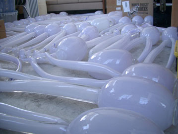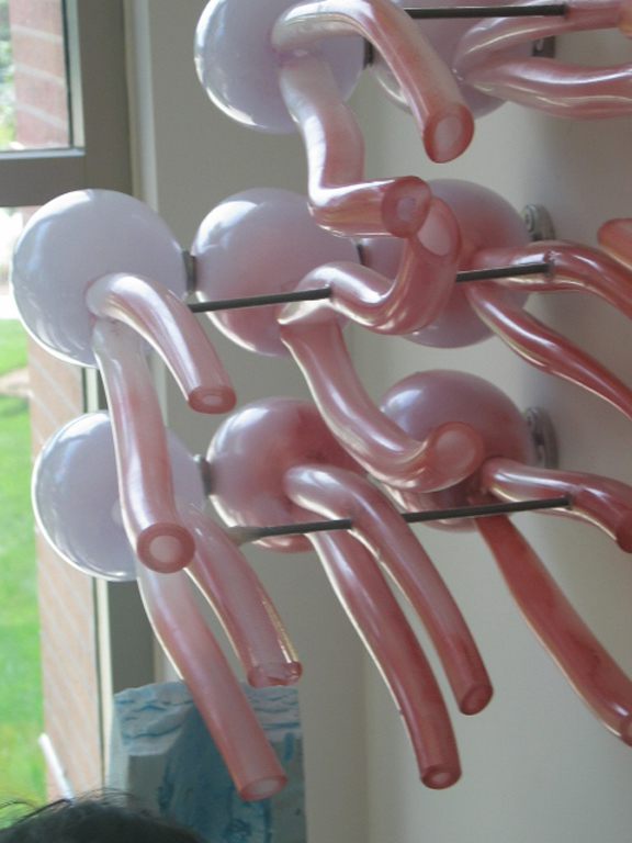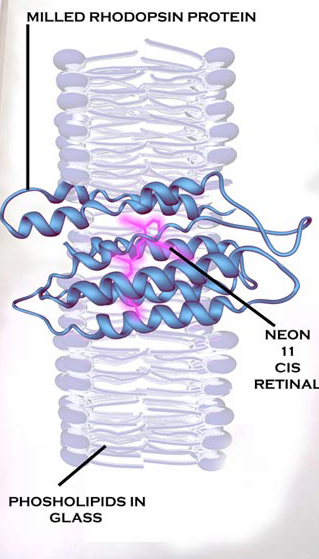 The lipids of the membrane are represented by blown glass forms. The protein portion of rhodopsin was created using a special technique that transfers protein structural data into 3-D forms using advanced rapid prototyping techniques. The chromophore at the heart of the protein is in neon.