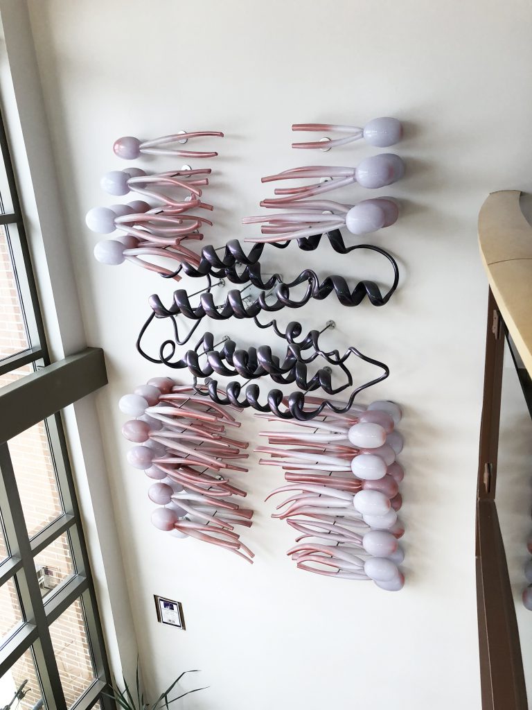 The sculpture depicts the relation of the rhodopsin protein to the lipid membrane. Rhodopsin is the member of a family of proteins that covert sensations such as light, heat, touch and sound to chemical signals that trigger cellular responses—the so called signal transduction family of proteins. This signal transduction proteins are important not only because they allow us to perceive the world through our senses but also because they are the targets of drugs that treat a wide range of diseases from psychosis to heart disease.