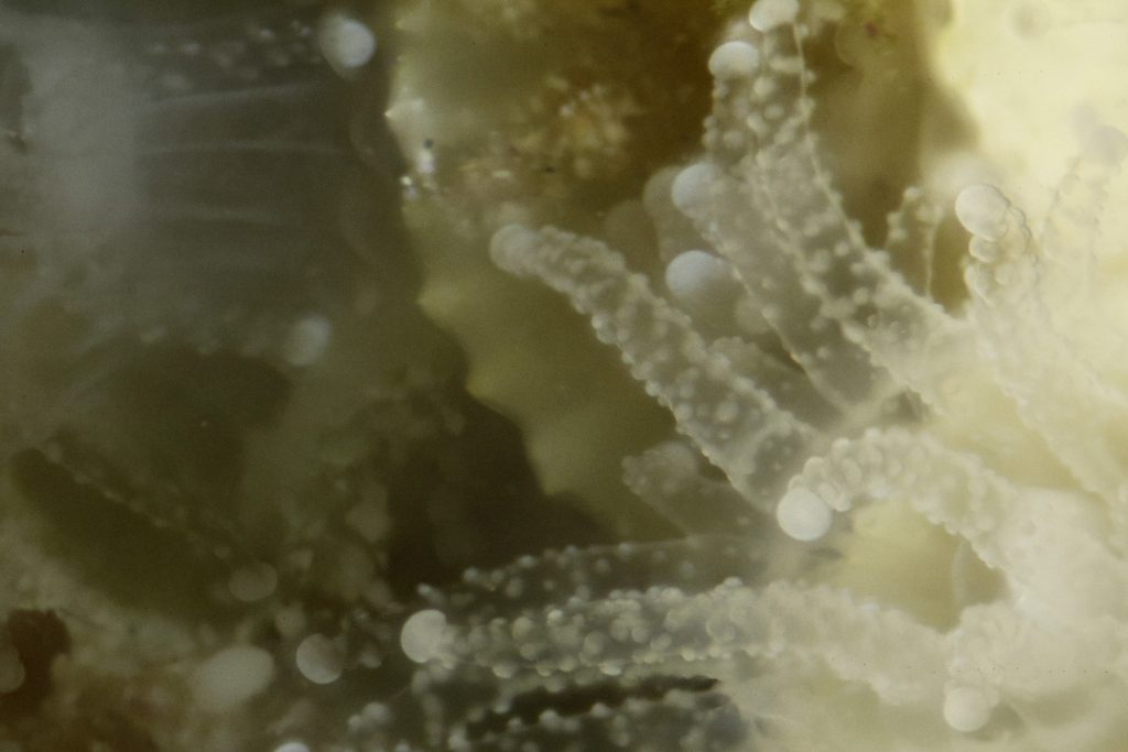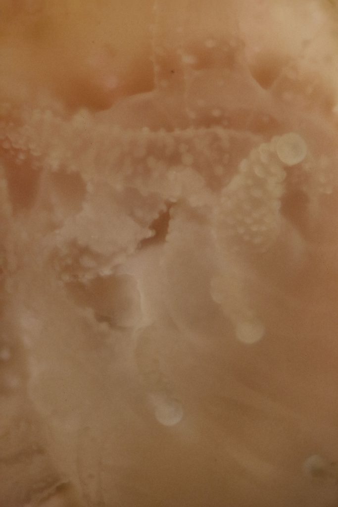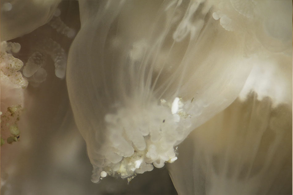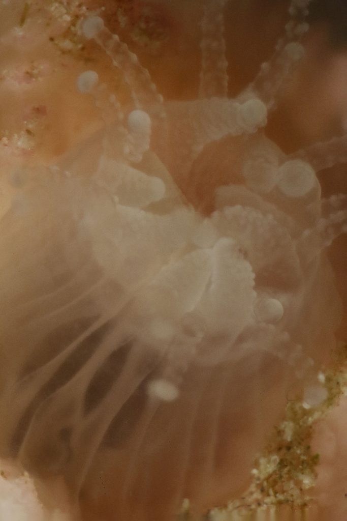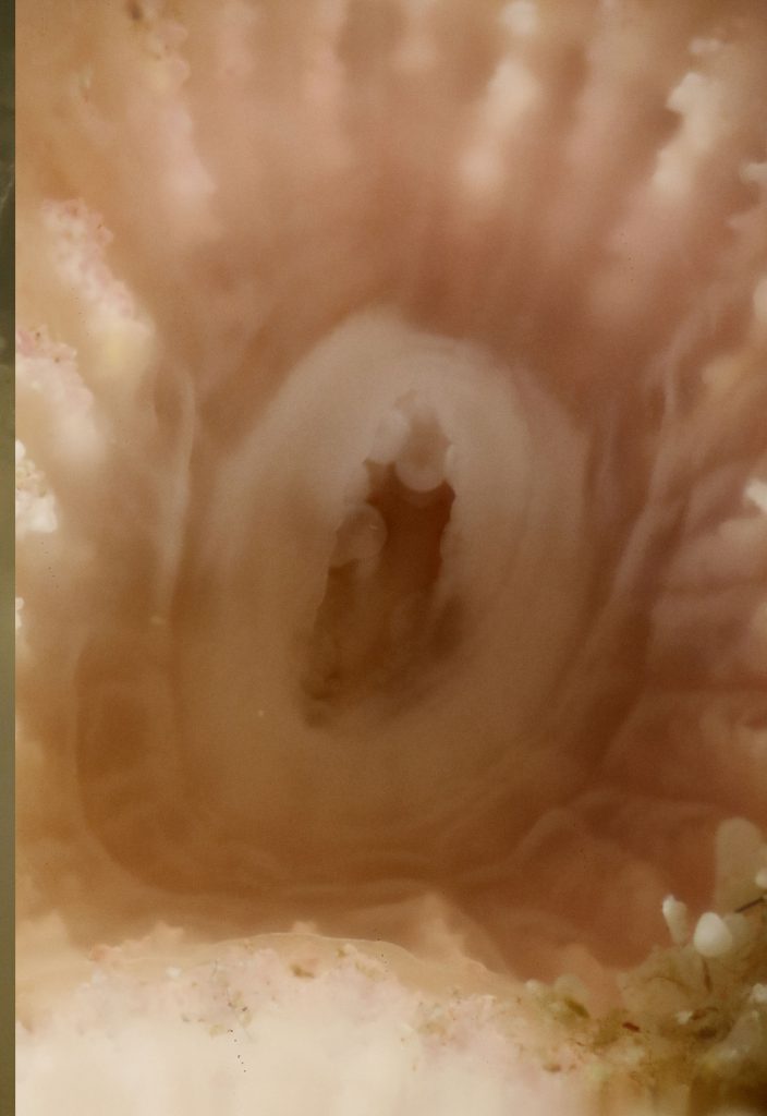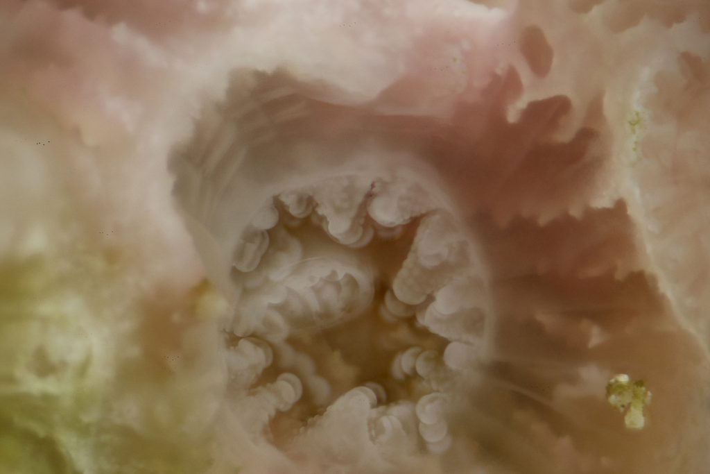 Description: The muse for “Rose” — a Portrait series of extreme close ups of the coral Astrangia poculata — comes from Cape Cod, Massachusetts and is typical of a coral polyp that inhabits the mid-Atlantic. Considered a coral “of least concern” it sprouts like dandelions at 20 feet and below. The Astrangia poculata is considered a deep water coral and thrives at a time when tropical corals are dying at a rapid rate worldwide. Resilient in non coral building cluster colonies, they seem according to each individual cluster to have acquired the diversifying adaptation of having the ability to either host Xooxanthallae or not unlike their tropical cousins that are all dependent on Xooxanthallae the symbiotic algae that inhabits coral issue and powers the animal making up coral about 90% of its energy intake. There are clusters with no Xooxanthallae surviving solely on plankton alone. Rose is one of those colonies of omnifarious plankton guzzling coral hence the soft translucent mineral enriched romantic micro portraits.