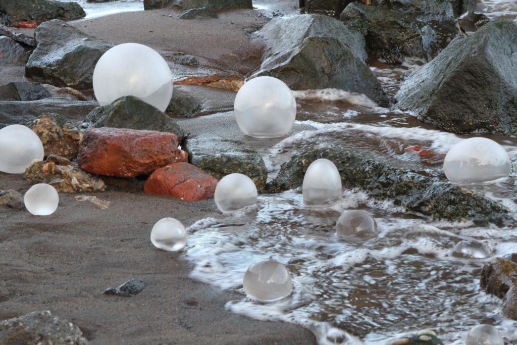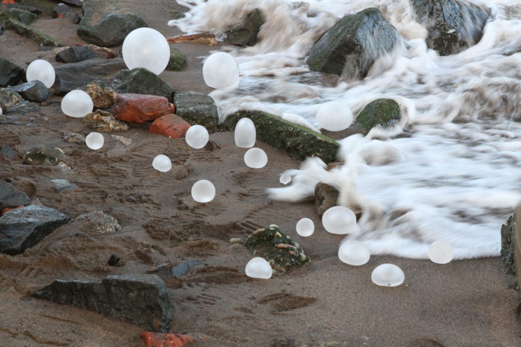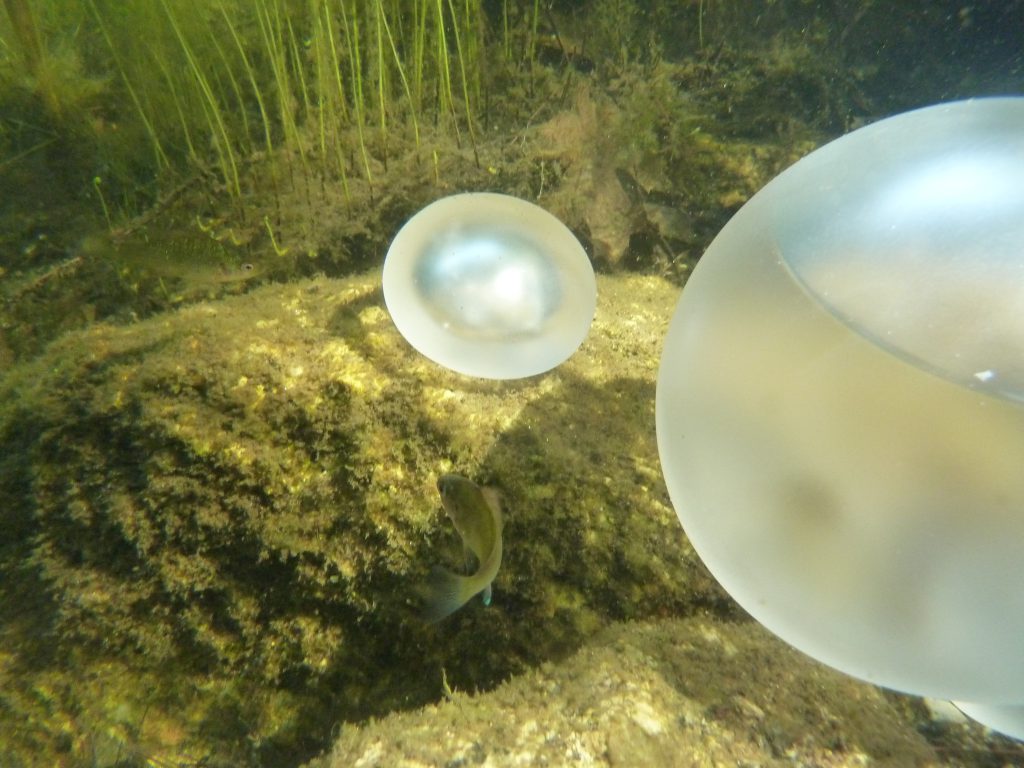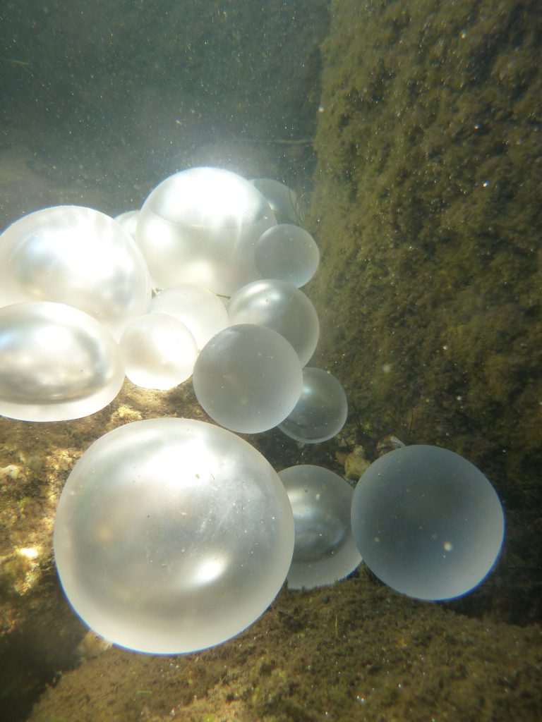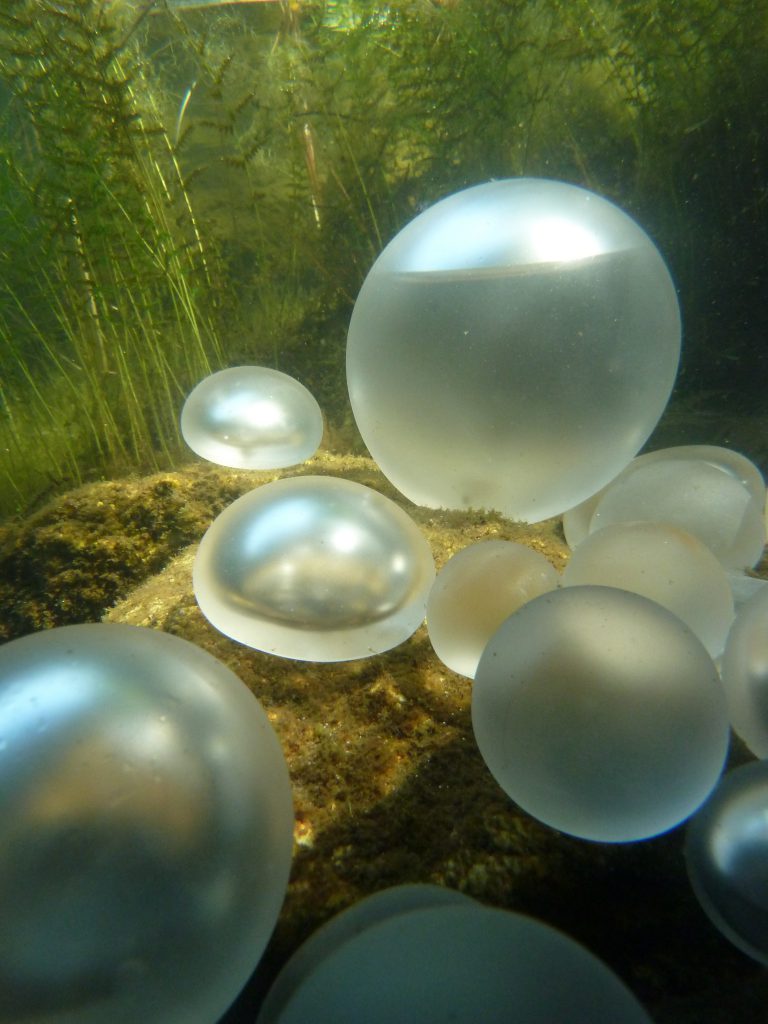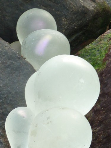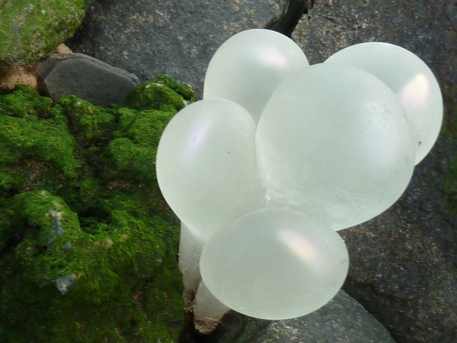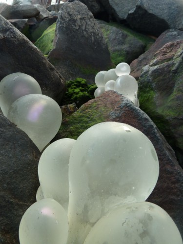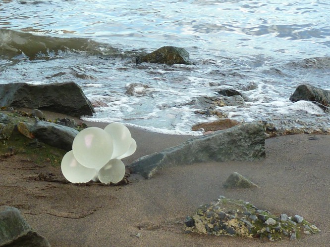These hand-blown bubbles appear in unexpected places in nature or the urban environments as if left but the spirits of of the spaces they occupy. The work is influenced by the Shinto religion of Japan which originated in Okinawa Japans most Southern Islands in which inanimate rocks and spots in nature are considered holy or possessed by spirits called kami. Whether nestled into moss in forest, submerged in a lake or placed on an urban beach these pieces draw attention to the beauty of the surroundings and how human-made objects can interact with nature.