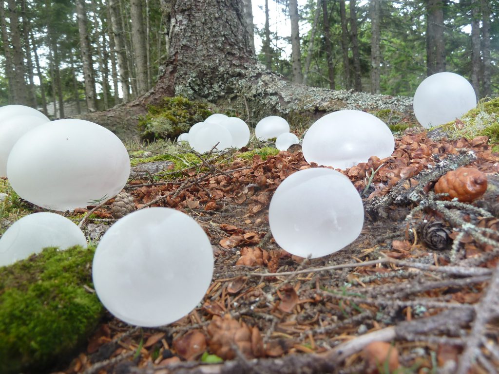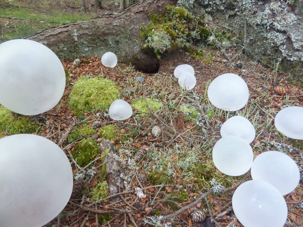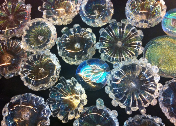Supernatural Series One (2012) was inspired by the beauty of the mushrooms in the moss-covered forests of Maine, where after a rain the mushrooms bloom. These pieces were blown by Mara G. Haseltine in Maine. This piece is meant to be seen in situ so that the viewer stumbles across them as if they have just discovered something left by a magical spirit. This piece is meant to enhance the beauty of the forest.