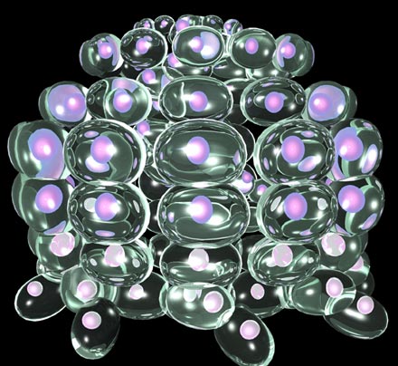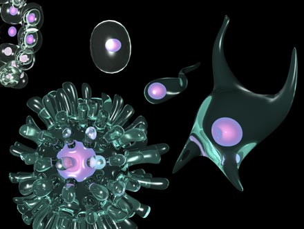 Spontaneously Differentiating Stem Cells: There are thousands of different kinds of cells within each body this set of inflatable would show the stems cells in different degrees of metamorphosis into various kinds of cell shapes. For example, a nerve cell would elongate and grow tendrils whereas a red blood cell would become a concave droplet shape. The cells would be more animate and lively as their differentiated shapes floated as if into a symphony of the variety of positions.